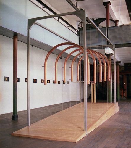 Allée sonore 2000, 450x150x300 cm. (Cuivre, pin, acajou, inox, son, électronique). CEAAC – bourse de la Région Alsace, 2000 Élevée à l’échelle du corps humain, cette allée de cuivre produit des harmoniques suivant le déplacement du corps dans l’espace. Le son se propage comme un écho à travers cet instrument de musique suspendu, qui vibre au contact des pas et du corps.…