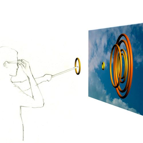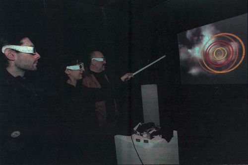 Cordes virtuelles 2007 - ZKM, KARLSRUHE, ALLEMAGNE « Violon virtuel » Violon virtuel interactif en 3D Instrument interactif virtuel en 3D, lunettes polarisantes, archet électronique, écran, projecteurs, hauts parleurs, ordinateurs. ZKM, centre d’art multimédia, Karlsruhe. Commande du Laboratoire des Systèmes Photoniques de Strasbourg. Conception sonore : Bruno de Chénérilles. Avec les lunettes polarisantes, le spectateur perçoit un violon virtuel constitué de 7 cordes cuivrées circulaires. Ces cordes flottent dans l’espace et avancent vers le spectateur l’une après l’autre en un mouvement aléatoire. En glissant l’archet réel sur la corde virtuelle, celle-ci résonne avec une variation colorée. Puis la corde activée s’éloigne dans le ciel pour laisser place à une nouvelle corde, avec de nouvelles harmoniques.…