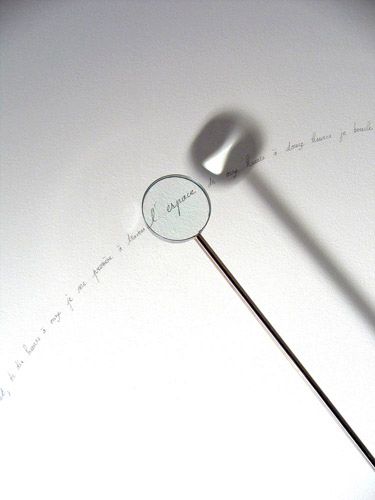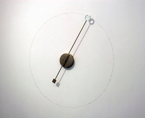 Loupe mécanique 2004, dia.115 cm. (Inox, moteur, mine de plomb). Scander le temps qui passe au rythme d’un fragment de poésie.…