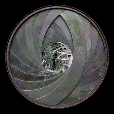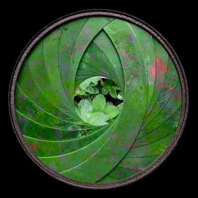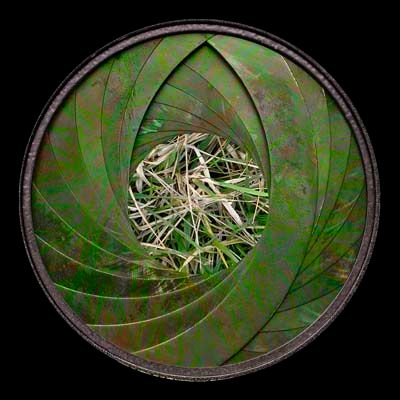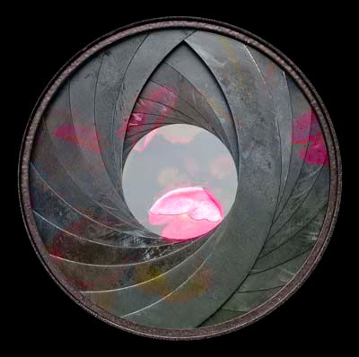 Dianatura 2004, diamètre 40cm, photographie sur alu dibond, tirage sur papier satin. Le diaphragme de l’appareil photographique est une métaphore de l’iris. Il représente la conscience transformée par son environnement, imprégnée de ses formes et de ses couleurs. La concentration du regard implique une conscience focalisée : observer au point de devenir la chose observée. Le regard est un « capteur ».…